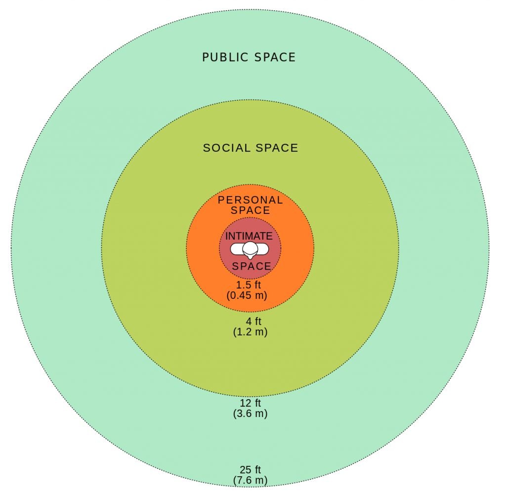È una distanza che manteniamo nelle interazioni interpersonali o, in altre parole, uno “spazio respiratorio”, un’area astratta che circonda ogni individuo. Questo spazio aiuta a regolare l’intimità nelle situazioni sociali controllando l’esposizione sensoriale. La possibilità di una maggiore stimolazione visiva, tattile, uditiva e olfattiva è migliorata a distanze più ravvicinate e le persone possono sentirsi invase e reagire negativamente quando altri adottano e si mantengono a una distanza interpersonale troppo stretta.²