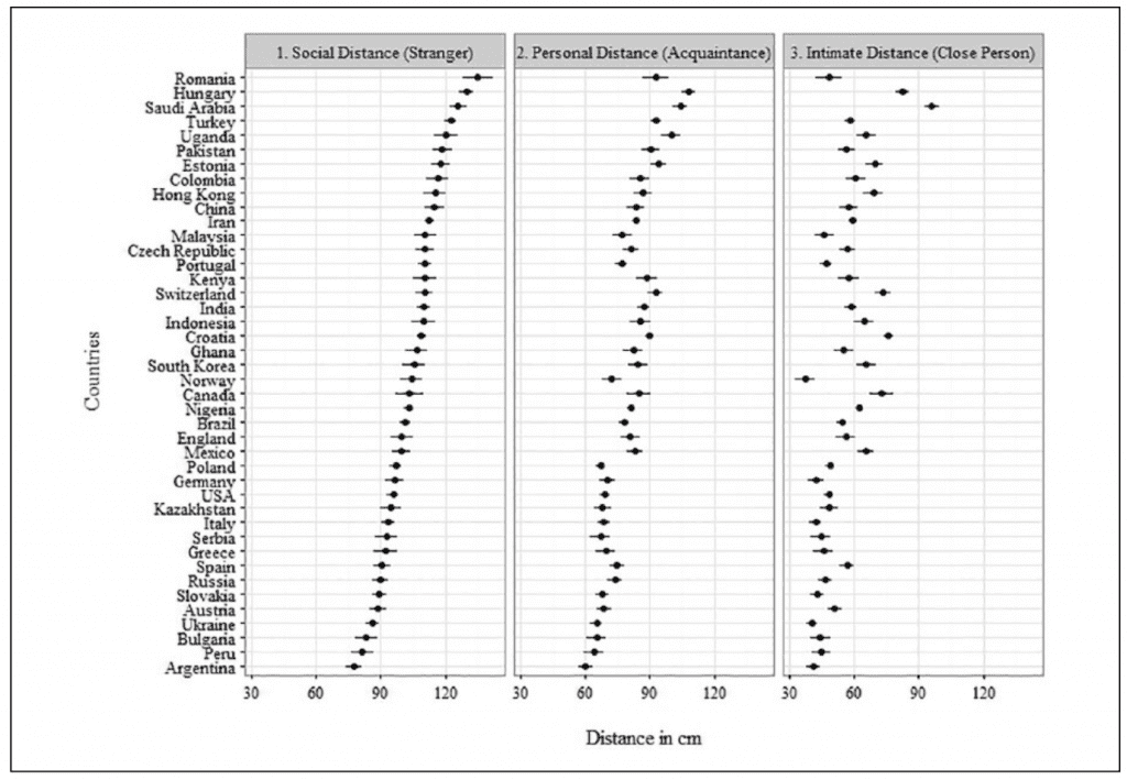 Oltre alle differenze soggettive, esistono numerose differenze culturali e geografiche. Lo studio del 2017 intitolato Preferred Interpersonal Distances: A Global Comparison³ ha sottoposto 9000 partecipanti, in 42 paesi ad una semplice domanda: ” Può indicare sul Diagramma di Edward T. Hall quale distanza adotterebbe per sentirsi a proprio agio nel parlare con uno sconosciuto, un amico o in una relazione più intima?”